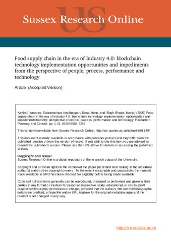 Kayikci, Yasanur, Subramanian, Nachiappan, Dora, Manoj and Bhatia, Manjot Singh (2022) Food supply chain in the era of Industry 4.0: blockchain technology implementation opportunities and impediments from the perspective of people, process, performance, and technology. Production Planning and Control, 33 (2-3). pp. 301-321. ISSN 09537287