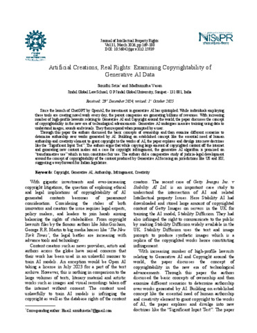 Setia, Sunidhi and Vasan, Madhumitha (2026) Artificial Creations, Real Rights: Examining Copyrightability of Generative AI Data. Journal of Intellectual Property Rights (JIPR), 31 (2). pp. 169-180. ISSN 0975-1076