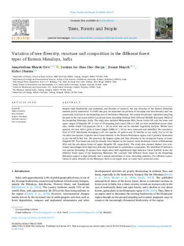 Devi, Samjetsabam Bharati, Sherpa, Suratna Sur Shan Sher, Manish, Kumar and Sharma, Kishor (2026) Variation of tree diversity, structure and composition in the different forest types of Eastern Himalaya, India. Trees, Forests and People, 24. ISSN 2666-7193