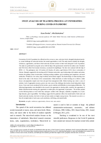 Soroka, Iryna and Zasluzhena, Alla (2021) SWOT analysis of teaching process at universities during COVID-19 pandemic. Psychological Journal, 7 (8). pp. 82-90. ISSN 2414004X