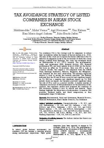 Tax avoidance (TA) is the strategy used by companies to reduce their tax liabilities within the bounds of the law (Jarboui et al., 2020). The aims of this study are to explore the factors effectted to the TA behavior of companies listed in the Association of South East Asian Nations (ASEAN) Stock Exchange. This study was developed based on Mukhtaruddin et al.’s (2025) research. The environmental, social, and governance (ESG), financial distress (FD), financial performance (FP), and board gender diversity (BGD) are the factors that have an effect on TA practices. Firm size (FS) is used as a control variable. The sample is 185 companies from the ASEAN Stock Exchange (Indonesia, Malaysia, Singapore, the Philippines, and Thailand) for five years observation. The multiple regression analysis is used to answer the research questions. The findings indicated that the FD and FP have a positive and significant impact on TA. ESG has a negative and significant impact on TA. BGD initially shows no impact, but becomes positively significant when the role of FS is used as a control variable. A smaller number of companies’ disclosure of ESG performance are the limitation of this research. The regulators should have prepared the standards of ESG disclosure, making it easy to control and monitor. These findings highlight the importance of policymakers to monitor ESG practices, financial health, and board composition, as they meaningfully shape TA behaviour.