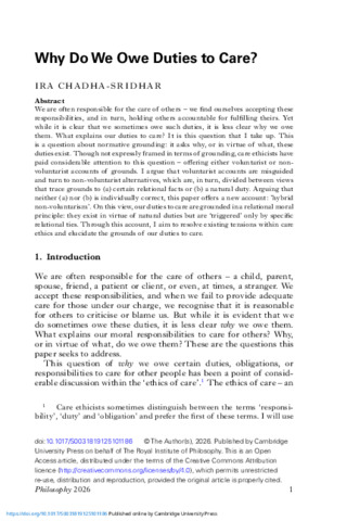 We are often responsible for the care of others – we find ourselves accepting these responsibilities, and in turn, holding others accountable for fulfilling theirs. Yet while it is clear that we sometimes owe such duties, it is less clear why we owe them. What explains our duties to care? It is this question that I take up. This is a question about normative grounding: it asks why, or in virtue of what, these duties exist. Though not expressly framed in terms of grounding, care ethicists have paid considerable attention to this question – offering either voluntarist or non-voluntarist accounts of grounds. I argue that voluntarist accounts are misguided and turn to non-voluntarist alternatives, which are, in turn, divided between views that trace grounds to (a) certain relational facts or (b) a natural duty. Arguing that neither (a) nor (b) is individually correct, this paper offers a new account: 'hybrid non-voluntarism'. On this view, our duties to care are grounded in a relational moral principle: they exist in virtue of natural duties but are ‘triggered' only by specific relational ties. Through this account, I aim to resolve existing tensions within care ethics and elucidate the grounds of our duties to care.