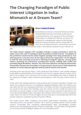 The Public Interest Litigation (‘PIL’) paradigm indicates a unique jurisdiction in which the Indian Courts relax rules of standing to admit any petition of ‘public interest’. The adoption of this jurisdiction transformed the Indian litigation paradigm from being dominated by ‘men with long purses’ to the last resort for the ‘oppressed and the marginalised’. The PIL litigation in India has been extremely successful in reforming investigative agencies, ensuring police reforms, protecting the environment, providing food security, enabling labor welfare and preventing illegal demolitions. However, PILs have been claimed to overstep the demarcation of boundaries between the three pillars of the government. Recent cases in 2026 indicate the adoption of a newer balanced approach between judicial activism and restraint.