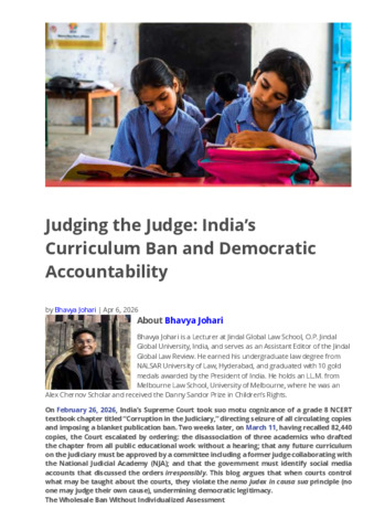 On February 26, 2026, India’s Supreme Court took suo motu cognizance of a grade 8 NCERT textbook chapter titled “Corruption in the Judiciary,” directing seizure of all circulating copies and imposing a blanket publication ban. Two weeks later, on March 11, having recalled 82,440 copies, the Court escalated by ordering: the disassociation of three academics who drafted the chapter from all public educational work without a hearing; that any future curriculum on the judiciary must be approved by a committee including a former judge collaborating with the National Judicial Academy (NJA); and that the government must identify social media accounts that discussed the orders irresponsibly. This blog argues that when courts control what may be taught about the courts, they violate the nemo judex in causa sua principle (no one may judge their own cause), undermining democratic legitimacy.