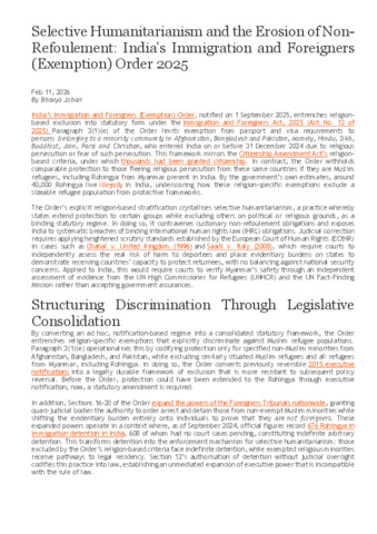 Selective humanitarianism and the erosion of non-refoulement: India’s immigration and foreigners (exemption) order 2025.