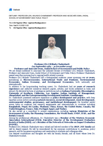 Obituary to Milindo Chakrabarti, Professor and Associate Dean, Jindal School of Government and Public Policy.