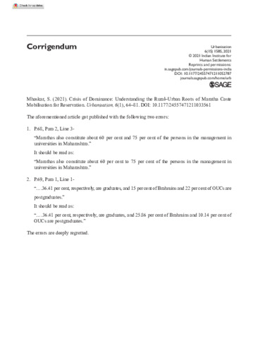 Mhaskar, Sumeet (2021) Crisis of dominance: Understanding the rural–urban roots of Maratha caste mobilisation for reservation. Urbanisation, 6 (1). pp. 64-81. ISSN 24563714