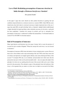 In this paper I argue that courts should use their judicial discretion in granting bail and conditions imposed therein on a minimum interference standard (MIS). Under MIS the courts should only refuse bail when it is absolutely necessary in light of particular facts of the case. I argue that under MIS, we need to develop ‘trial as if innocent’ standard which would demand a higher threshold for depriving liberty unless absolutely necessary for fair trial or until guilt has been established. I introduce the concept of probable guilt bias to rationalise how presumption of innocence is understood in Indian bail jurisprudence. I’ve focused mainly on section 437 & 438 CRPC for doctrinal analysis.