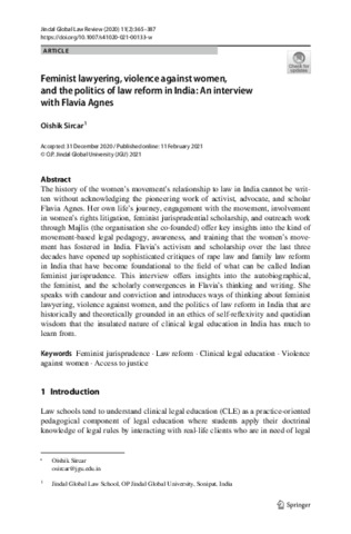 Sircar, Oishik (2020) Feminist lawyering, violence against women, and the politics of law reform in India: An interview with Flavia Agnes. Jindal Global Law Review, 11 (2). pp. 365-387. ISSN 9752498