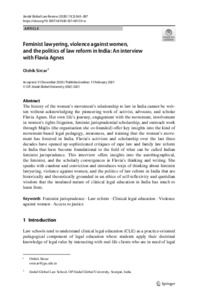 The history of the women’s movement’s relationship to law in India cannot be written without acknowledging the pioneering work of activist, advocate, and scholar Flavia Agnes. Her own life’s journey, engagement with the movement, involvement in women’s rights litigation, feminist jurisprudential scholarship, and outreach work through Majlis (the organisation she co-founded) ofer key insights into the kind of movement-based legal pedagogy, awareness, and training that the women’s movement has fostered in India. Flavia’s activism and scholarship over the last three decades have opened up sophisticated critiques of rape law and family law reform in India that have become foundational to the field of what can be called Indian feminist jurisprudence. This interview offers insights into the autobiographical, the feminist, and the scholarly convergences in Flavia’s thinking and writing. She speaks with candour and conviction and introduces ways of thinking about feminist lawyering, violence against women, and the politics of law reform in India that are historically and theoretically grounded in an ethics of self-refexivity and quotidian wisdom that the insulated nature of clinical legal education in India has much to learn from.
