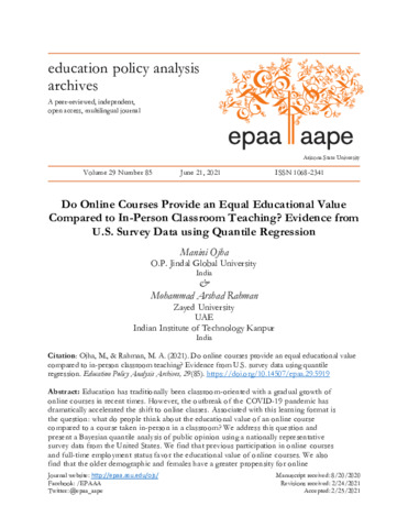 Ojha, Manini and Rahman, Mohammad Arshad (2021) Do online courses provide an equal educational value compared to in-person classroom teaching? Evidence from U.S. survey data using quantile regression. Education Policy Analysis Archives, 29 (85). pp. 1-25. ISSN 10682341