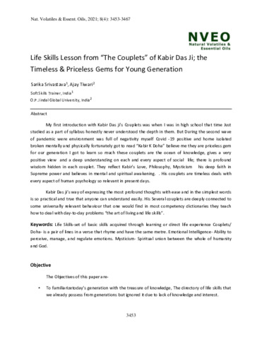 Srivastava, Sarika and Tiwari, Ajay (2021) Life skills lesson from “The Couplets” of Kabir Das Ji: The timeless and priceless gems for young generation. Natural Volatiles and Essential Oils, 8 (4). pp. 3453-3467. ISSN 21489637