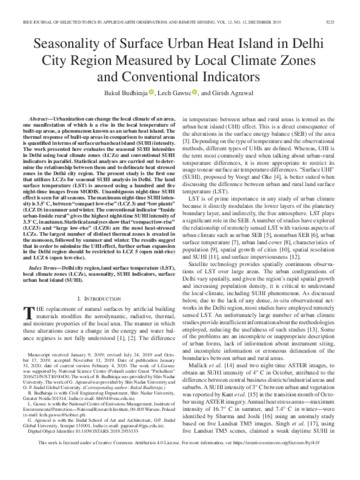 Budhiraja, Bakul, Gawuc, Lech and Agrawal, Girish (2019) Seasonality of surface urban heat island in Delhi city region measured by local climate zones and conventional indicators. IEEE Journal of Selected Topics in Applied Earth Observations and Remote Sensing, 12 (12): 8976413. pp. 5223 -5232. ISSN 19391404