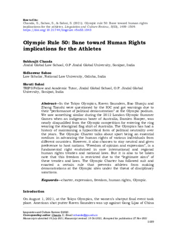 Chanda, Subhrajit, Sahoo, Sidheswar and Sahni, Shruti (2021) Olympic rule 50 : Bane toward human rights implications for the athletes. Linguistics and Culture Review, 5 (S3). pp. 1489-1509. ISSN 2690103X