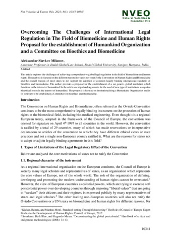 Milanov, Aleksandar (2021) Overcoming the challenges of international legal regulation in the field of biomedicine and human rights: Proposal for the establishment of humankind organization and a committee on bioethics and biomedicine. Natural Volatiles and Essential Oils, 8 (5). pp. 10341-10345. ISSN 21489637