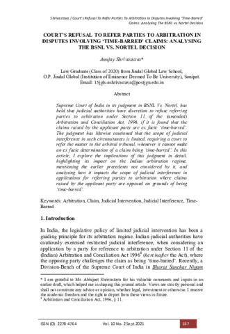 Shrivastava, Anujay (2021) Court’s refusal to refer parties to arbitration in disputes involving ‘time-barred’ claims: Analysing the BSNL vs. Nortel decision. International Journal of Legal Studies and Research, 10 (2). pp. 168-182. ISSN 22784764