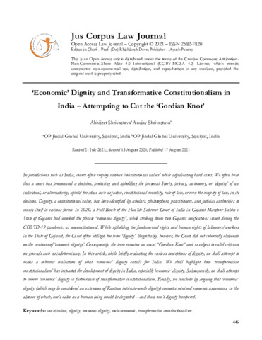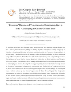 Shrivastava, Anujay and Shrivastava, Abhijeet (2021) ‘Economic’ dignity and transformative constitutionalism in India: Attempting to cut the ‘Gordian Knot'. Corpus Law Journal, 1 (4). pp. 446-457. ISSN 25827820