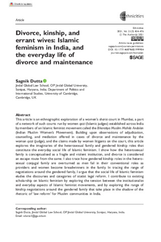 Dutta, Sagnik (2021) Divorce, kinship, and errant wives: Islamic feminism in India, and the everyday life of divorce and maintenance. Ethnicities, 21 (3). pp. 454-476. ISSN 14687968