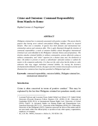 Philippine criminal law is commonly associated with positive conduct. The powers that be purport that having never ordered extra-judicial killings, liability cannot be incurred therefor. That view is mistaken. It ignores how both domestic and international law criminalizes actions and omissions alike. This is aptly illustrated through the doctrine of command responsibility: a mode of omission liability echoed throughout International Criminal Law and embedded in the Philippines’ domestic history and jurisprudence. The doctrine attaches criminal liability to military commanders, persons effectively acting as military commanders, and “other” superiors for a distinct actus reus: the dereliction of duty—the failure to prevent or repress a subordinates’ unlawful conduct or submit the matter to the competent authorities. It is thus not the order alone but the failure to order otherwise that may trigger individual criminal liability. By tracing the doctrine’s development from Manila to Rome, the paper cures the common misconception of crime and illustrates how omissions have long been punished in Philippine legal order.