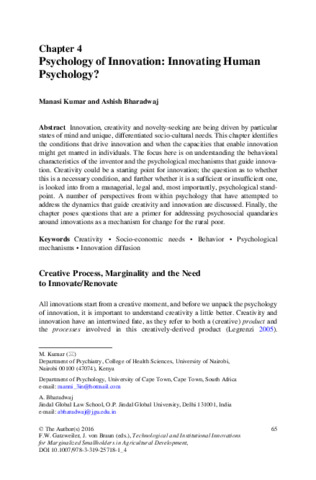 Innovation, creativity and novelty-seeking are being driven by particularstates of mind and unique, differentiated socio-cultural needs. This chapter identifiesthe conditions that drive innovation and when the capacities that enable innovationmight get marred in individuals. The focus here is on understanding the behavioralcharacteristics of the inventor and the psychological mechanisms that guide innova-tion. Creativity could be a starting point for innovation; the question as to whetherthis is a necessary condition, and further whether it is a sufficient or insufficient one,is looked into from a managerial, legal and, most importantly, psychological stand-point. A number of perspectives from within psychology that have attempted toaddress the dynamics that guide creativity and innovation are discussed. Finally, thechapter poses questions that are a primer for addressing psychosocial quandariesaround innovations as a mechanism for change for the rural poor.