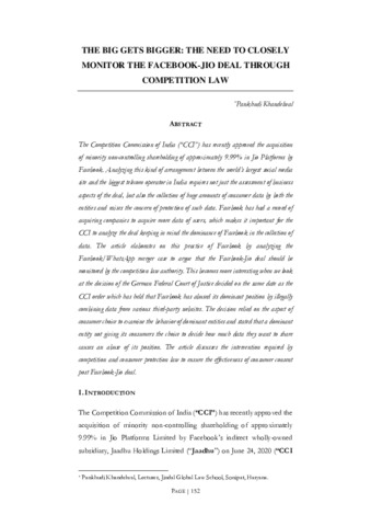 Khandelwal, Pankhudi (2020) The big gets bigger: The need to closely monitor the Facebook-Jio deal through competition law. RGNUL Student Research Review, 7 (1). pp. 152-161.