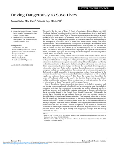 Sinha, Samrat and Roy, Nobhojit (2013) Driving dangerously to save lives. Prehospital and Disaster Medicine, 28 (1). p. 83. ISSN 1049023X