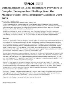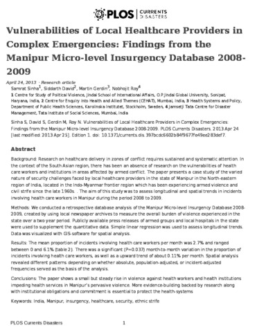 Sinha, Samrat, David, Siddarth, Gerdin, Martin and Roy, Nobhojit (2013) Vulnerabilities of local healthcare providers in complex emergencies: findings from the Manipur micro-level insurgency database 2008-2009. PLoS Currents. ISSN 21573999