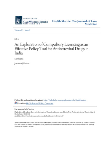 Jain, Dipika and Darrow, Jonathan J (2013) An exploration of compulsory licensing as an effective policy tool for antiretroviral drugs in India. Health Matrix: Journal of Law-Medicine, 23 (2). pp. 425-457. ISSN 0748383X
