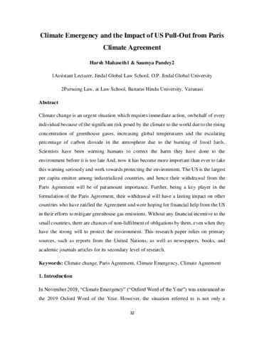 Mahaseth, Harsh and Pandey, Saumya (2021) Climate emergency and the impact of US pull-out from Paris climate agreement. GEHU’s Law Review, 10 (1). pp. 32-41.