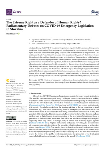 Steuer, Max (2022) The extreme right as a defender of human rights? Parliamentary debates on COVID-19 emergency legislation in Slovakia. Laws, 11 (2). pp. 1-19. ISSN 2075-471X