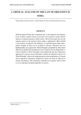 Gupta, Ridima and Ashwin V., Jayesh (2022) A critical analysis on the law of obscenity in India. Indian Journal of Law and Legal Research, 3 (2). pp. 1566-1573. ISSN 2582-8878