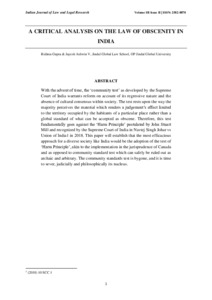 With the advent of time, the ‘community test’ as developed by the Supreme Court of India warrants reform on account of its regressive nature and the absence of cultural consensus within society. The test rests upon the way the majority perceives the material which renders a judgement’s effect limited to the territory occupied by the habitants of a particular place rather than a global standard of what can be accepted as obscene. Therefore, this test fundamentally goes against the ‘Harm Principle’ postulated by John Stuart Mill and recognized by the Supreme Court of India in Navtej Singh Johar vs Union of India1 in 2018. This paper will establish that the most efficacious approach for a diverse society like India would be the adoption of the test of ‘Harm Principle’, akin to the implementation in the jurisprudence of Canada and as opposed to community standard test which can safely be ruled out as archaic and arbitrary. The community standards test is bygone, and it is time to sever, judicially and philosophically its nucleus.