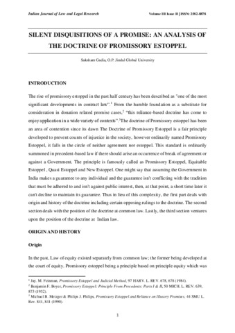 Gadia, Saksham (2022) Silent disquisitions of a promise: An analysis of the doctrine of promissory estoppel. Indian Journal of Law and Legal Research, 3 (2). pp. 1995-2000. ISSN 2582-8878