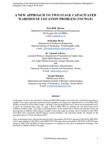 Sharma, RRK, Drave, Jai Kumar, Drave, Vinayak A. and Rahman, Ateequr (2021) A new approach to two stage capacitated warehouse location problem (TSCWLP). In: International Conference on Industrial Engineering and Operations Management, August 16-18, 2021, Bangalore, India.