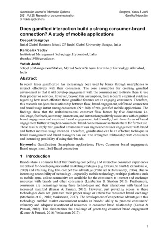 Sangroya, Deepak, Yadav, Rambalak and Joshi, Yatish (2021) Does gamified interaction build a strong consumer-brand connection? A study of mobile applications. Australasian Journal of Information Systems, 25. pp. 1-23. ISSN 13262238