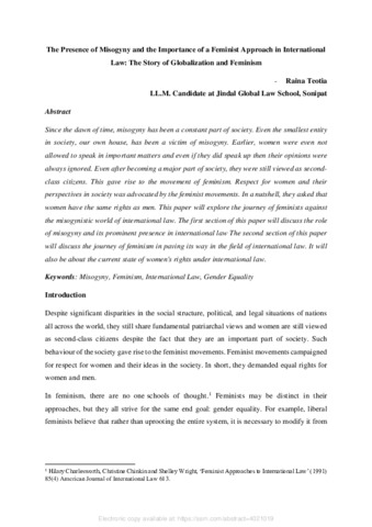 Teotia, Raina (2021) The presence of misogyny and the importance of a feminist approach in international law: The story of globalization and feminism. [Preprint]