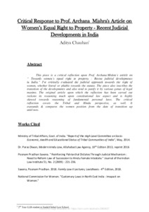 This piece is a critical reflection upon Archana Mishra’s article on “ Towards women’s equal right to property : Recent judicial developments in India.” I've critically evaluated the judicial approach towards the right of women, whether literal or pliable towards the statute. The piece also inscribes the transition of the developments and also tend to justify it by various genus of legal maxims. The original article upon which the reflection has been carved out reckons its reasoning much upon constitutional law aspect and is highly skewed towards reasoning of fundamental personal laws. The critical reflection covers the Tribal and Hindu perspective, as well. It expounds & compares the women position from the date of transition up until now.