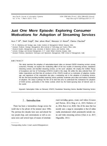 T M, Arun, Singh, Shaili, Khan, Sher Jahan, Ul Akram, Manzoor and Chauhan, Chetna (2021) Just one more episode: Exploring consumer motivations for adoption of streaming services. Asia Pacific Journal of Information Systems, 3 (1). pp. 17-42. ISSN 22885404