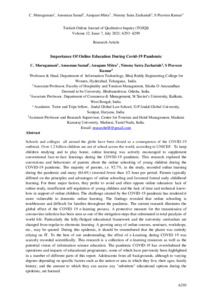 Murugamani, C, Samal, Ansuman, Mitra, Anupam, Zachariah, Nimmy Saira and Kumar, S Praveen (2021) Importance Of Online education during Covid-19 pandemic. Turkish Online Journal of Qualitative Inquiry (TOJQI), 12 (7). pp. 6293-6299. ISSN 6293-6299
