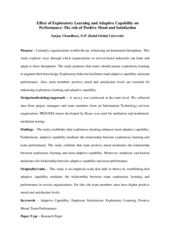 Originality/value – This study is an empirical study that adds to theory by establishing that adaptive capability mediates the relationship between team exploratory learning and performance in service organizations. For this, the team members must have higher positive mood and satisfaction levels.