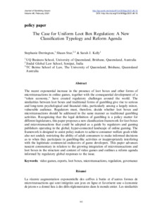 Derrington, Stephanie, Star, Shaun and Kelly, Sarah (2021) The case for uniform loot box regulation: A new classification typology and reform agenda. Journal of Gambling Issues, 46. pp. 302-332. ISSN 1910-7595