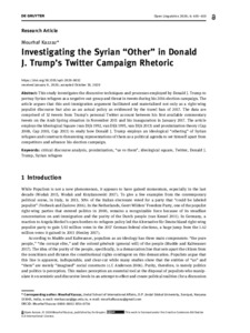 Kazzaz, Mourhaf (2020) Investigating the Syrian “Other” in Donald J. Trump’s Twitter Campaign Rhetoric. Open Linguistics, 6 (1). pp. 601-610. ISSN 23009969