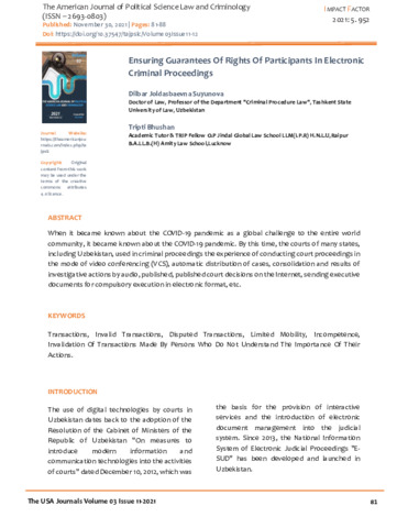 Suyunova, Dilbar Joldasbaevna and Bhushan, Tripti (2021) Ensuring guarantees of rights of participants in electronic criminal proceedings. The American Journal of Political Science Law and Criminology, 3 (11-12). pp. 81-88. ISSN 2693-0803