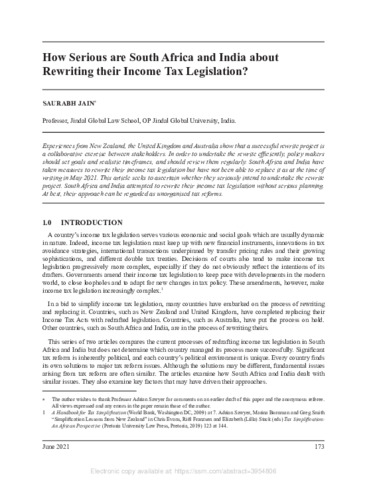 Jain, Saurabh (2021) How serious are South Africa and India about rewriting their income tax legislation? New Zealand Journal of Taxation Law and Policy, 27: 173. ISSN 1322-4417
