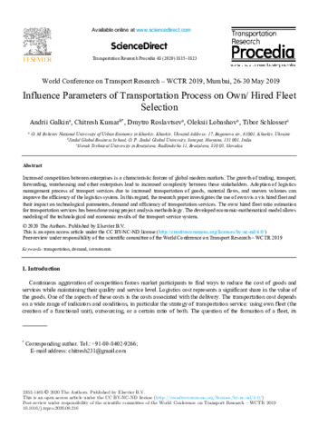 Galkin, Andrii, Kumar, Chitresh, Roslavtsev, Dmytro, Lobashov, Oleksii and Schlosser, Tibor (2020) Influence parameters of transportation process on own/ hired fleet selection. In: World Conference on Transport Research – WCTR 2019, 26-30 May 2019, Mumbai.