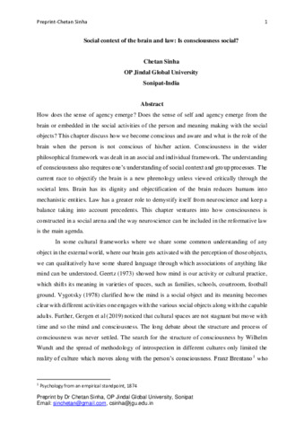 Sinha, Chetan (2022) Social context of the brain and law: Is consciousness social? [Preprint] (Unpublished)
