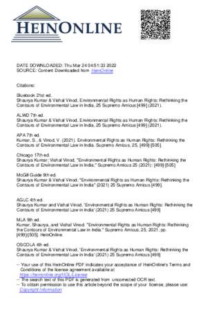 Kumar, Shaurya and Vinod, Vishal (2021) Environmental rights as human rights: Rethinking the contours of environmental law in India. Supremo Amicus, 25. pp. 499-505. ISSN 2456-9704