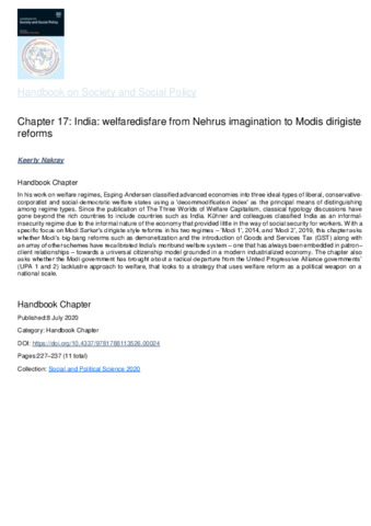Nakray, Keerty (2020) India: welfaredisfare from Nehrus imagination to Modis dirigiste reforms. In: Handbook on society and social policy. Edward Elgar, Cheltemham, pp. 227-237. ISBN 9781788113526
