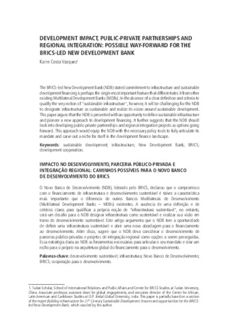 Vazquez, Karin Costa (2020) Development impact, public-private partnerships and regional integration : possible way-forward for the BRICS-led new development bank. Tempo do mundo (22). pp. 175-187. ISSN 2675-150X