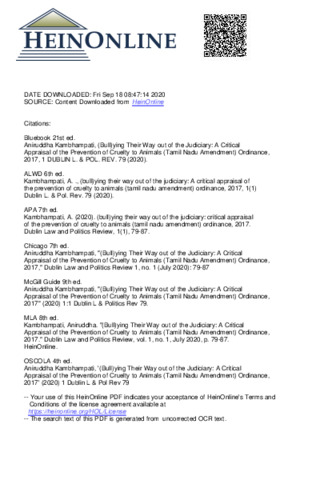Kambhampati, Aniruddha (2020) (Bull)ying their way out of the judiciary: a critical appraisal of the prevention of cruelty to animals (Tamil Nadu amendment) ordinance, 2017. Dublin Law and Politics Review, 1 (1). pp. 79-87.
